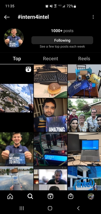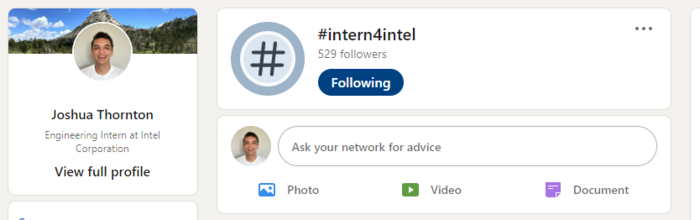 Upload a screenshot showing that you follow #intern4intel on any social media platform