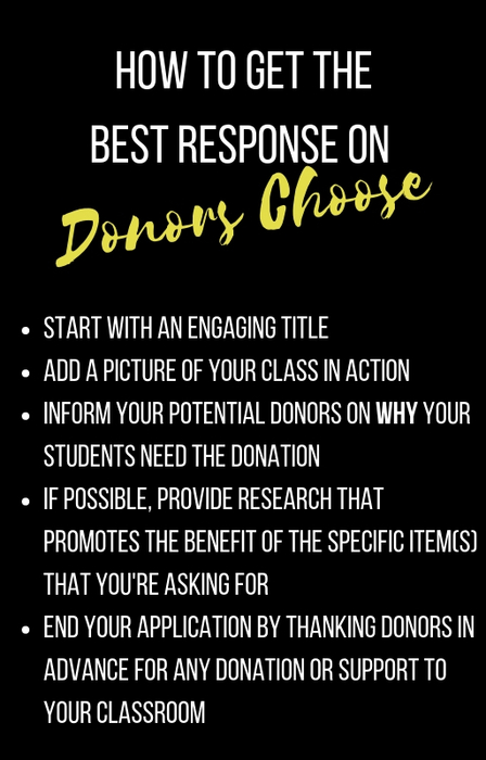 What are 5 tips that you have for writing a winning Donors Choose application based on what they did well and what they did not do well. Create this as an image/infographic use Canva, Adobe Post, or any other tool you prefer to use.