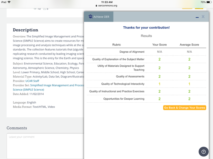Go to https://www.oercommons.org/ find a lesson plan to review and review it online. Submit screen shots of your review to earn your badge. Make sure to be critical and suggest changes in your review. THERE IS A RUBRIC ON LESSONS THAT YOU MUST USE. Click the EVALUATE Button.