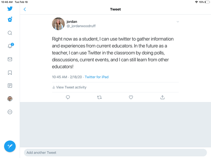 After learning about how we as teachers can use twitter, I have come to the conclusion that twitter is much more than a social media outlet used for fun. I have learned that as a teacher we can follow other educators and learn from their experiences and their knowledge, we can use it for a discussion outlet, and we can use polls. Our students can also take advantage of twitter for research projects, discussions, following certain accounts that relate to a certain topic, and to post graphics, models or anything else for other peers to see. I think that one thing that I enjoyed most about twitter for teachers was the discussion portion. It is a fun, creative way to interact with others in the classroom without having to be present in the actual classroom!