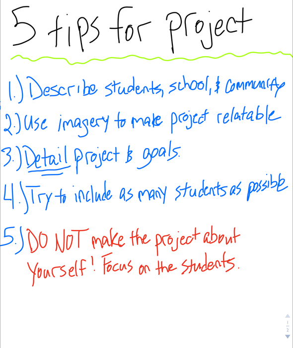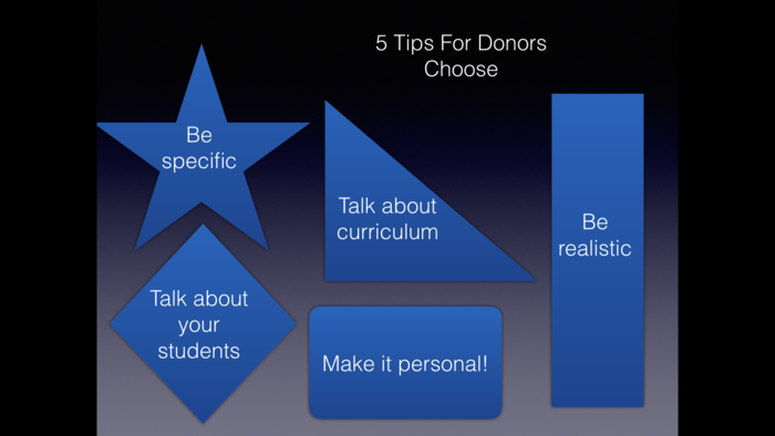 1. Be student-centered. 2. Be specific and concise 3. Be creative. ( either with title or picture) 4. Be simple and realistic 5. Give specific details of how materials will be used/ why they are needed for the class.
