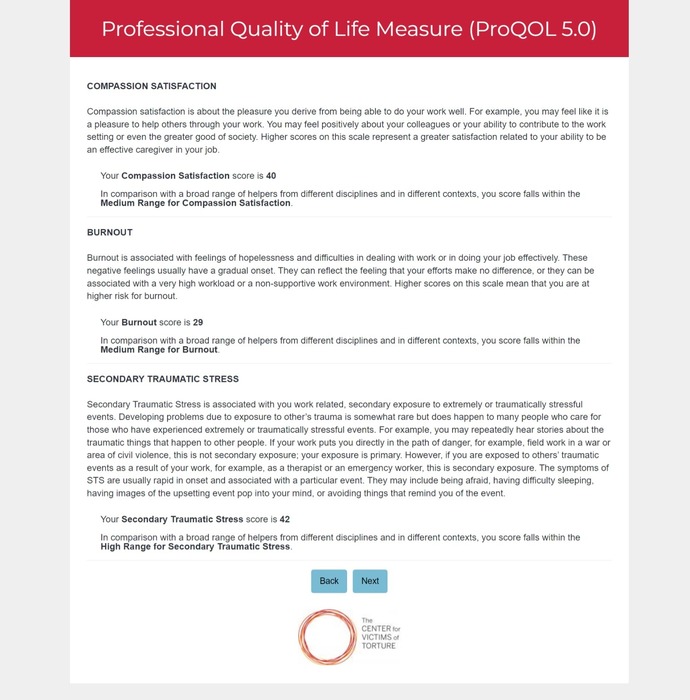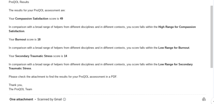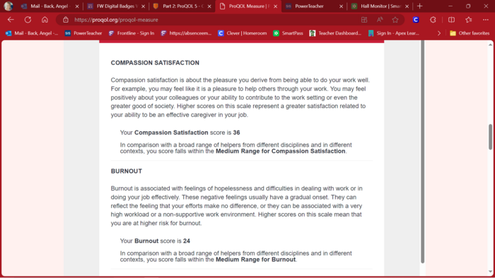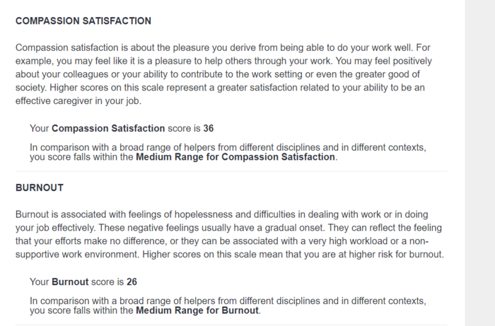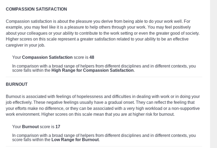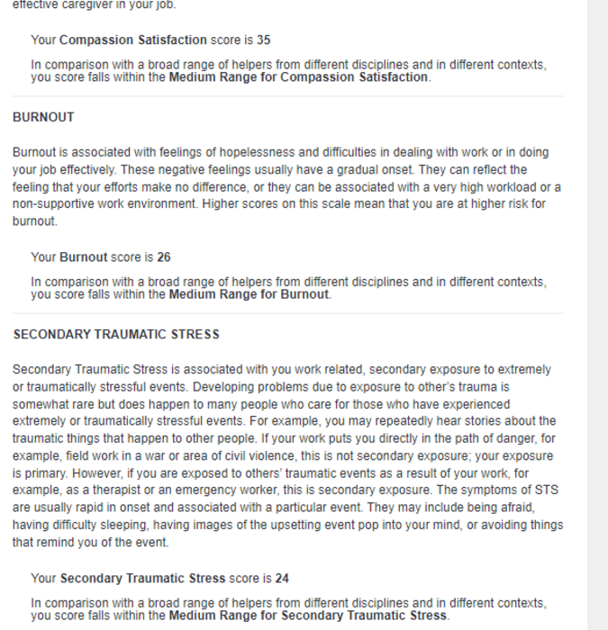 In comparison with a broad range of helpers from different disciplines and in different contexts, you score falls within the Low Range for Burnout.