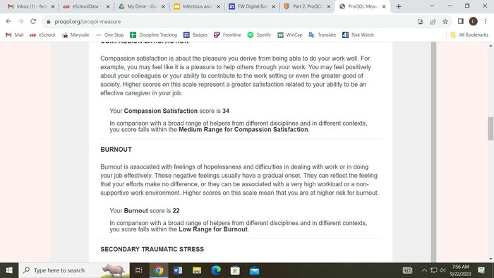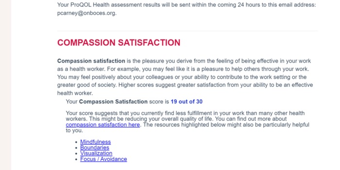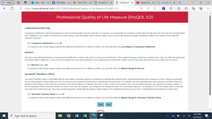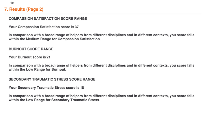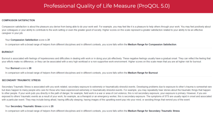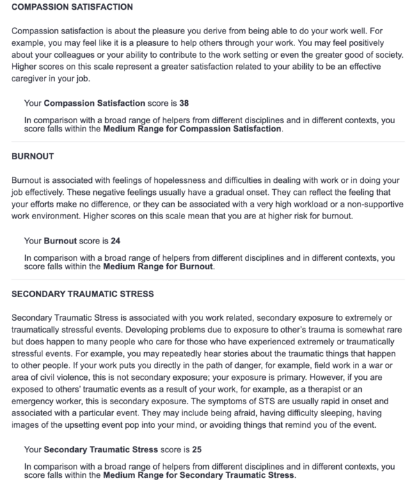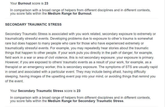 I was in the medium range for burnout and for secondary traumatic stress. I am somewhat relieved because I feared that I would score higher after watching the videos and that it would be impossible to turn around. I at least feel like I can get a handle on this issue.
