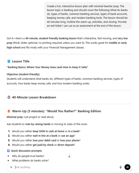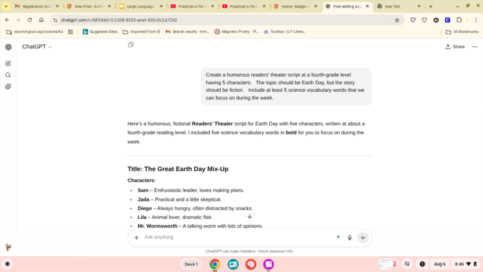 [1} Watch: Practical AI for Instructors and Students Part 3: Prompting AI [2] Review the slidedeck Large Language Model Prompts for Educators [3] As evidence, experiment with different prompts guided by the slidedeck, upload a screenshot of one of your prompts/output.