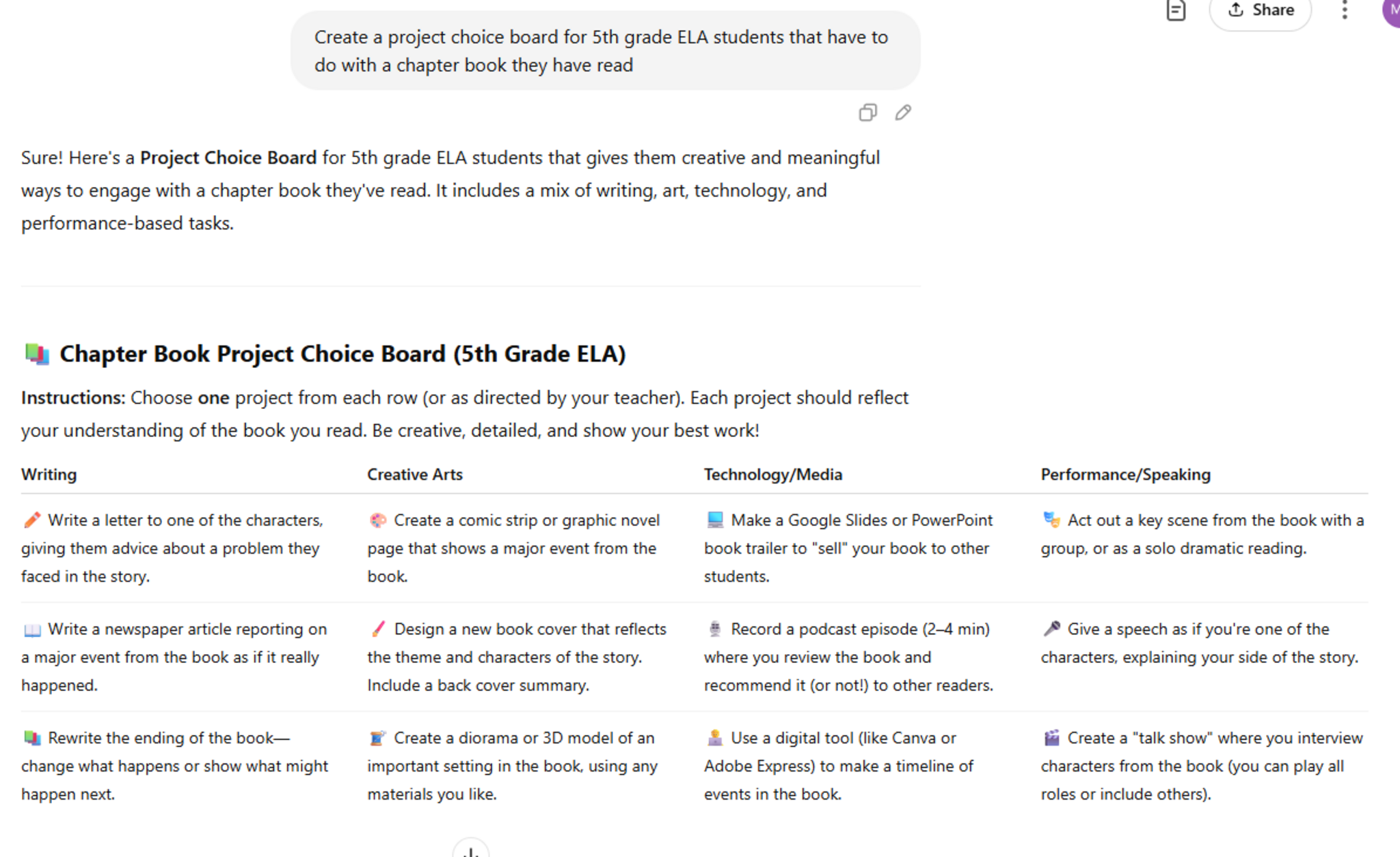 AI request to create a chapter book project board.