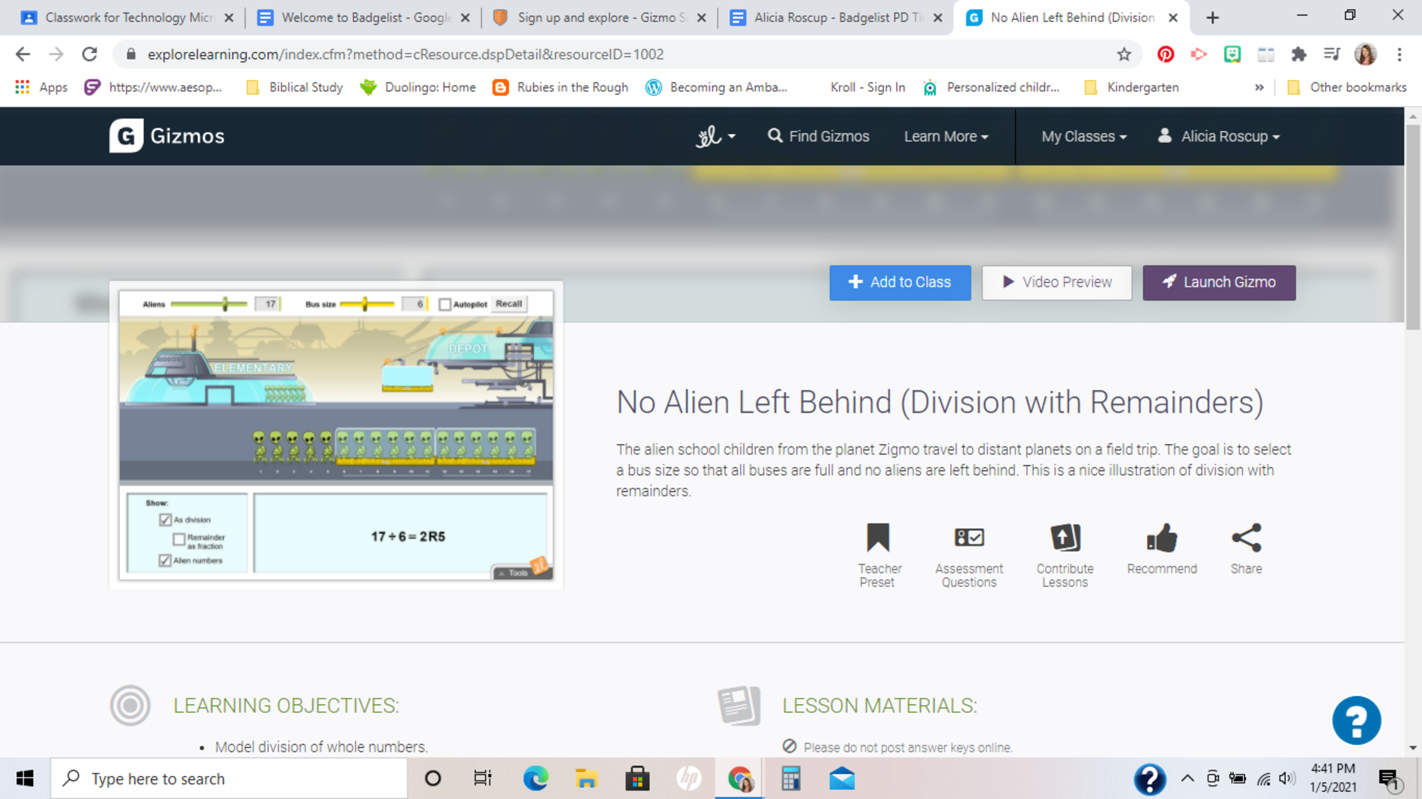 The Gizmo I explored was "No Alien Left Behind (Division with Remainders)".