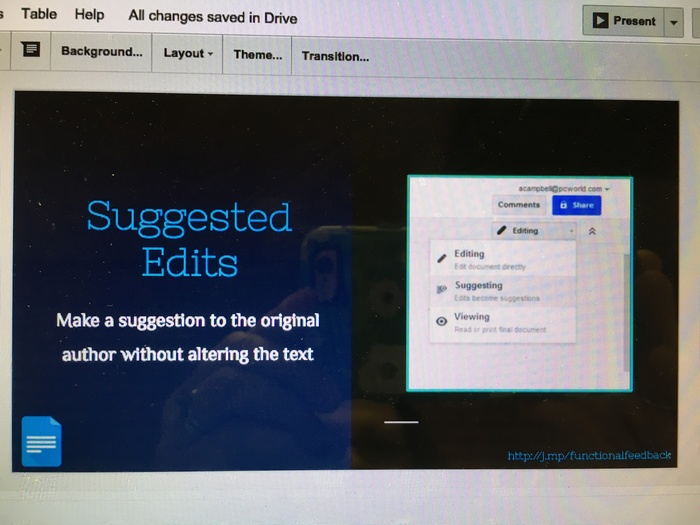Suggestions in Google drive instead of editing allows students to share their ideas with each other, but still retain ownership.