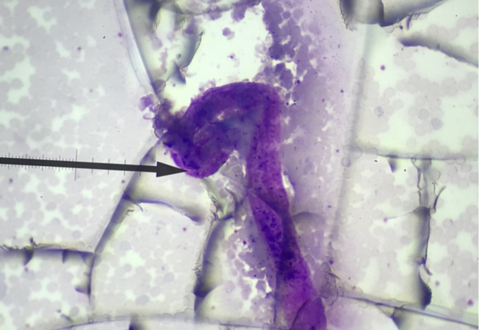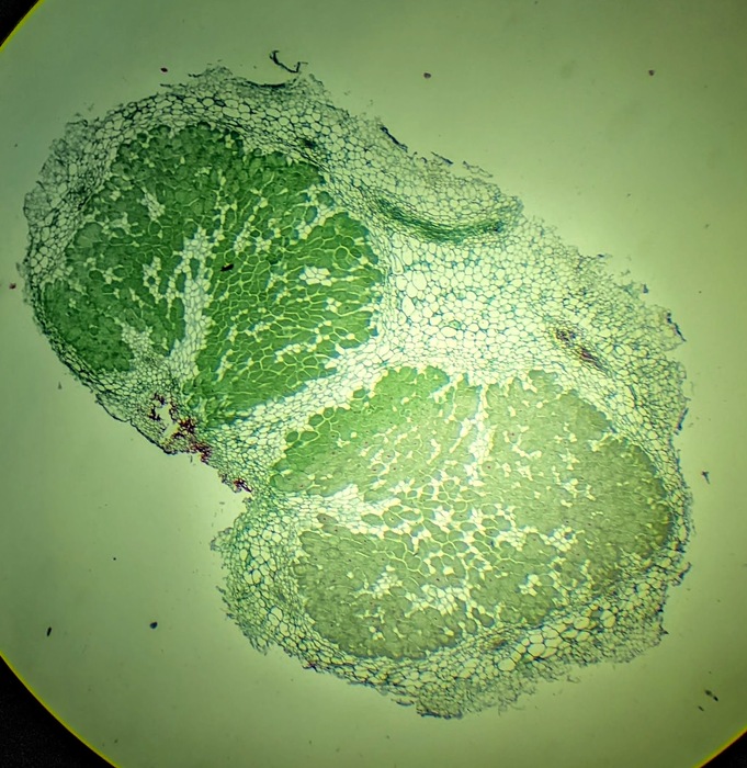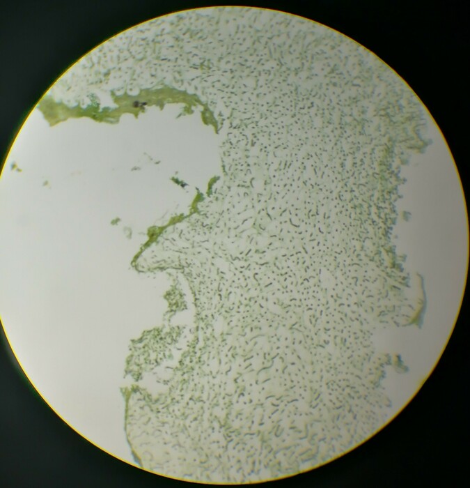 Post an image of a light or electron microscope specimen that was imaged and processed digitally. Include a description of the specimen, microscopy type, and magnification.