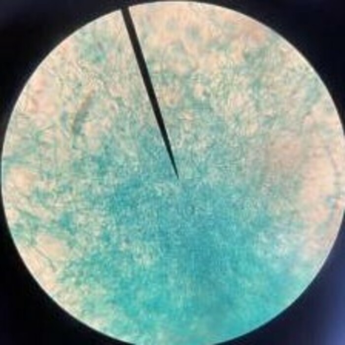 This is a image of penicillium mycelium conidiophores viewed through a 40x scope. This image has also been edited through the photos program on a windows computer.