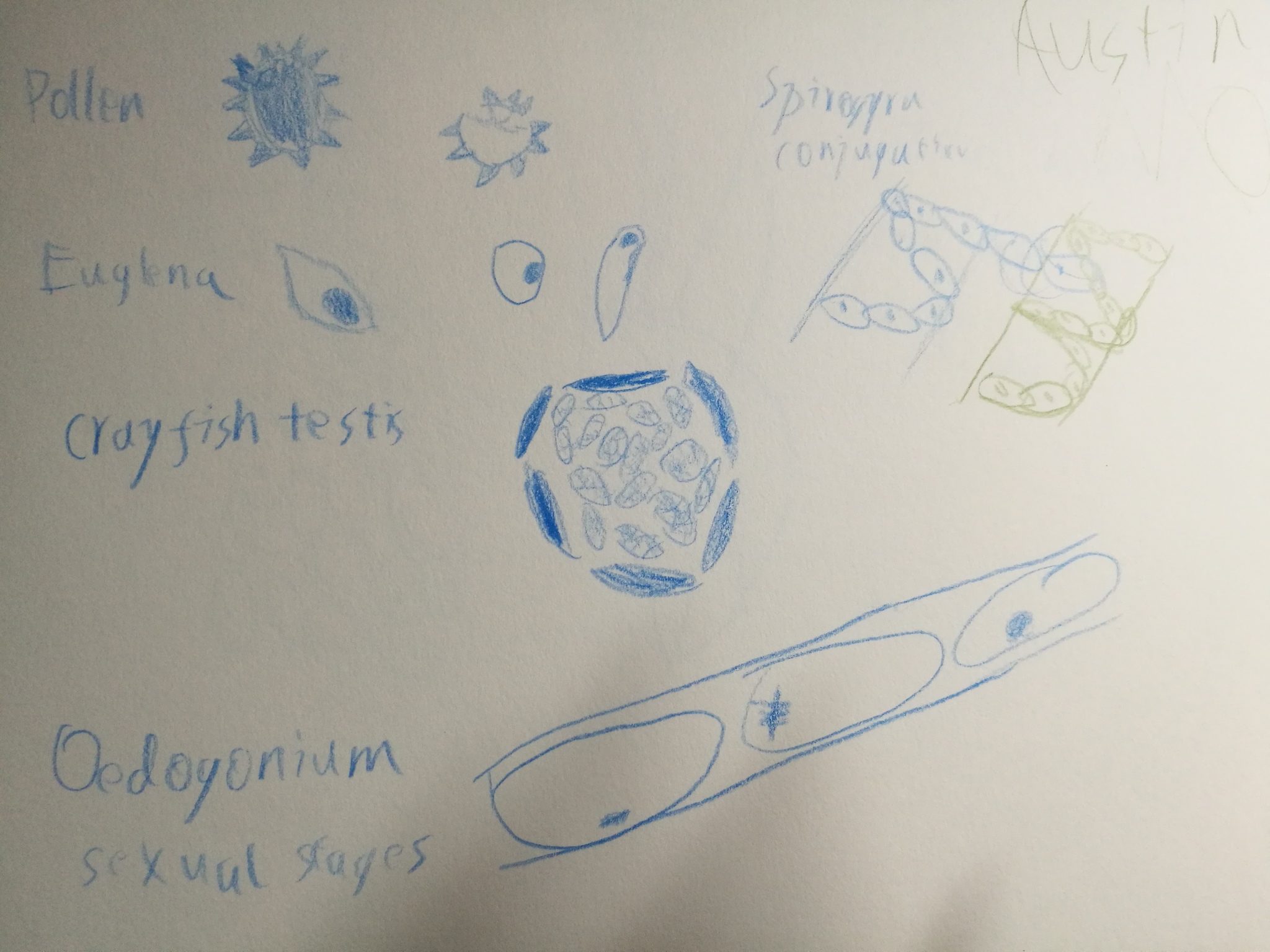 Pollen, Euglena, Crayfish Testis, Oodogonium sexual stages, spirogyra conjugation.