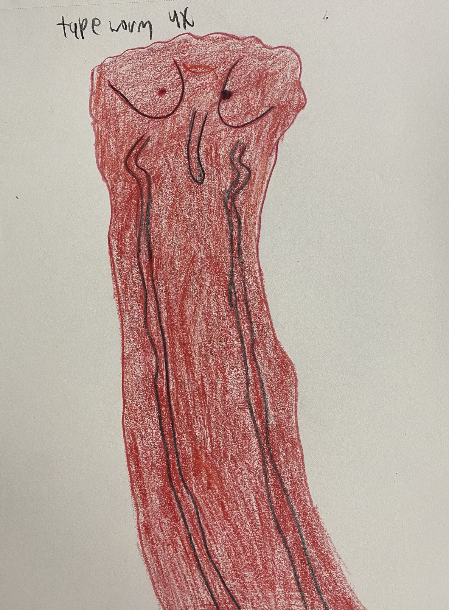Drawing of a tape worm under a 4x scope. I’m this scenario a 4x scope is used because of the size of the specimen.