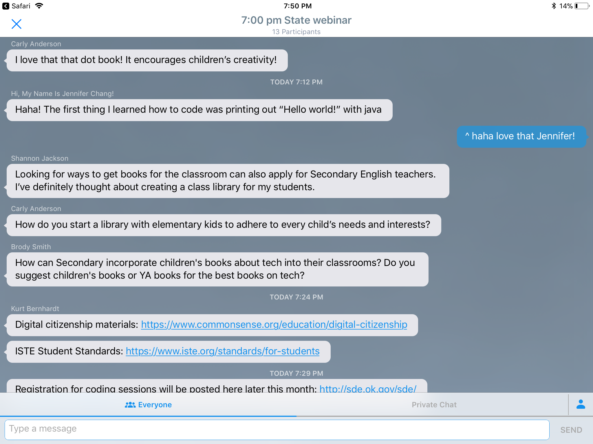 Screenshot of Webinar chat