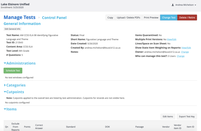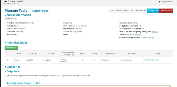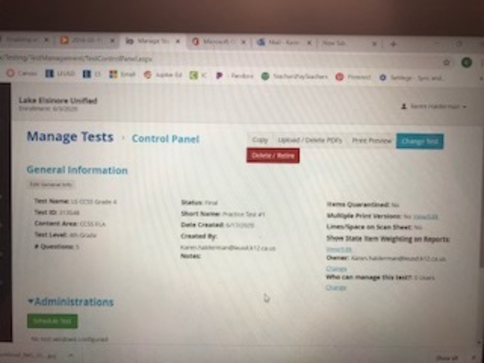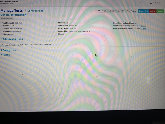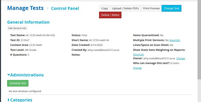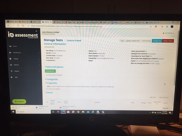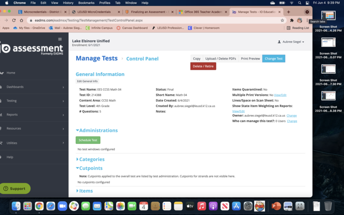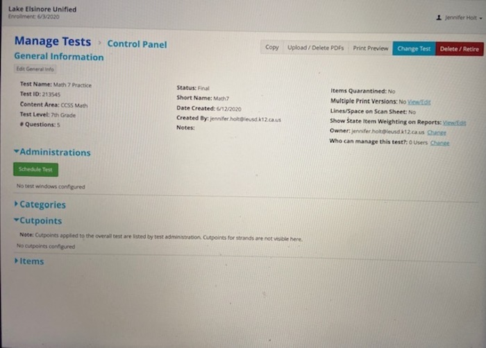 Watch this informational video on creating an assessment then create a short five question test, and post your test name and ID number.