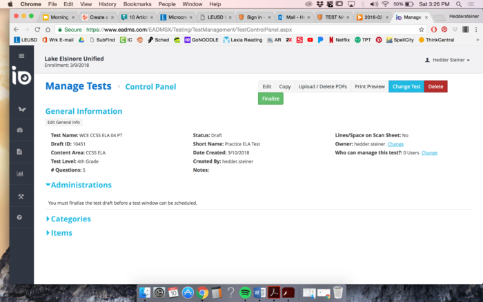 Watch this informational video on creating an assessment then create a short five question test, and post your test name and ID number.