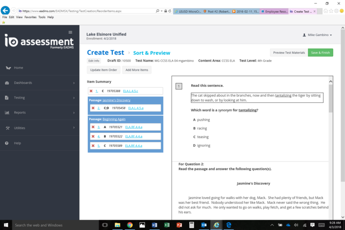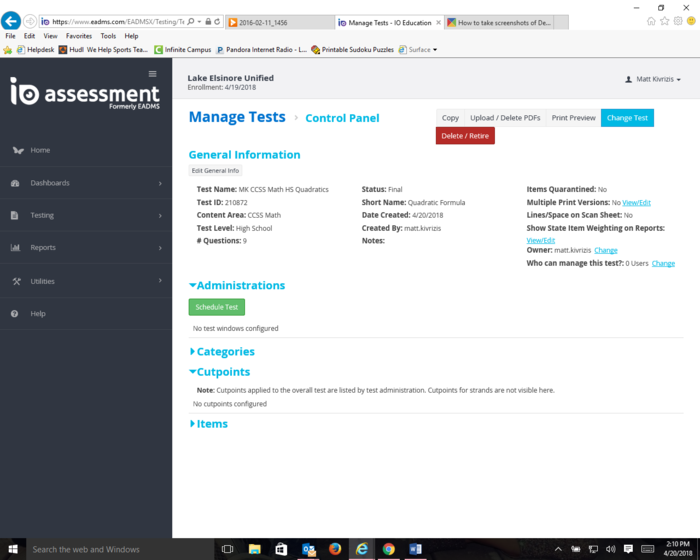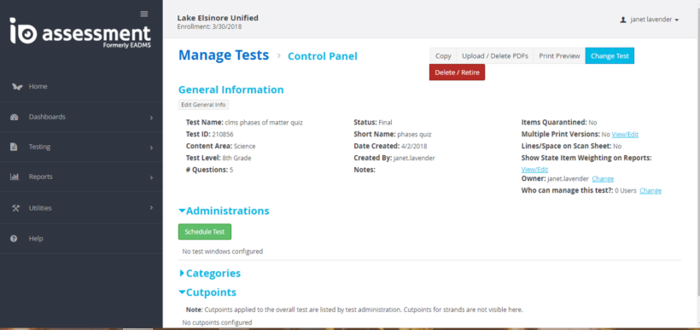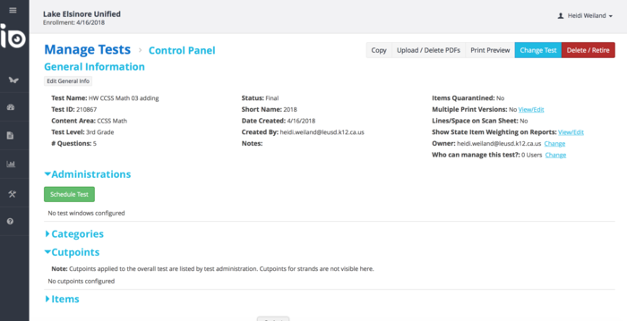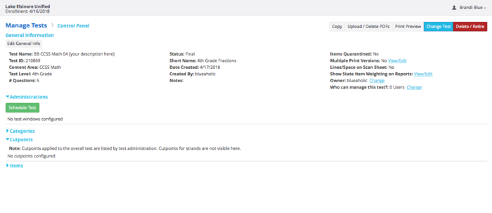 Watch this informational video on creating an assessment then create a short five question test, and post your test name and ID number.