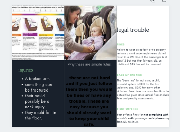 Create a pamphlet using Canva to advocate for carseat safety. Describe the causes of injury for children when not wearing carseats correctly. Describe the legal trouble one could find themself in when not following Arkansas carseat laws. Submit Canva document here as an image.