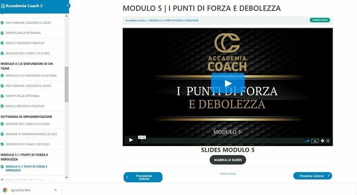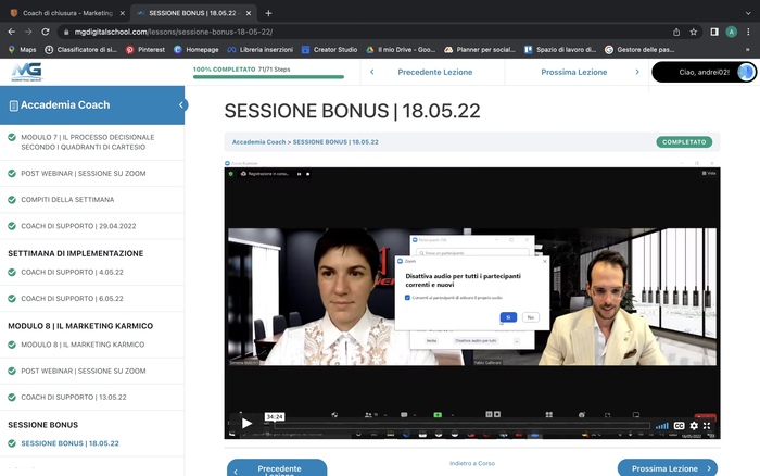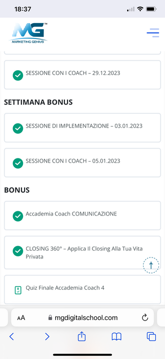 Lo studente deve completare con successo il programma intensivo di 12 settimane, partecipando attivamente alle lezioni formative ed alle sessioni applicative con i Coach. Si prega di caricare uno screenshot dell'avvenuto completamento delle lezioni nel proprio account di Marketing Genius.