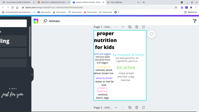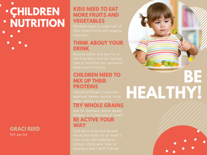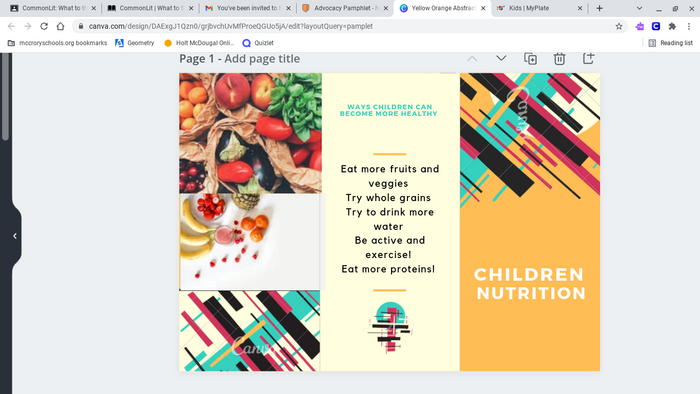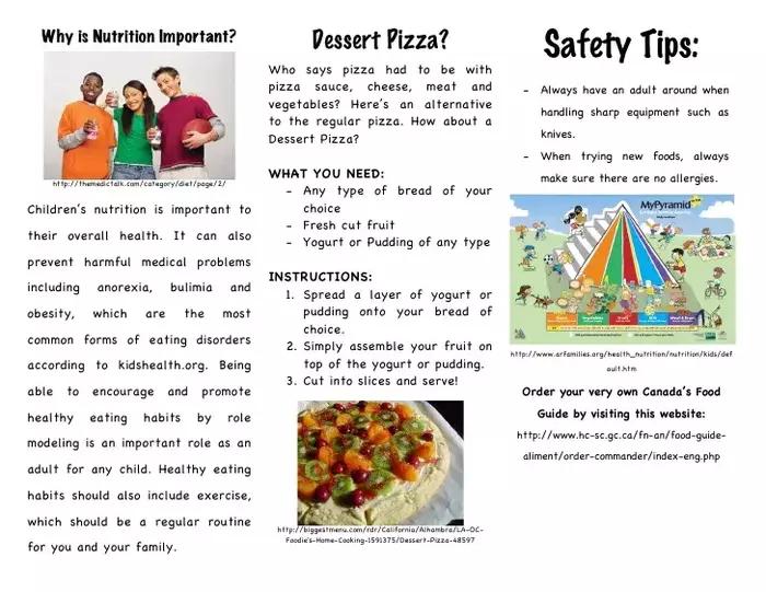 Create a pamphlet describing the proper nutrition for a child. Use MyPlate.gov as a resource. Use Canva to complete your pamphlet, and download your completed document as an image. Upload that Image here.
