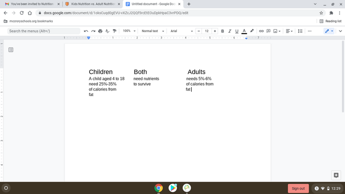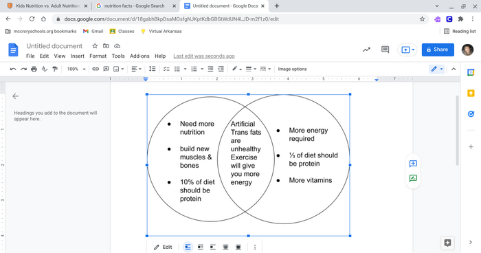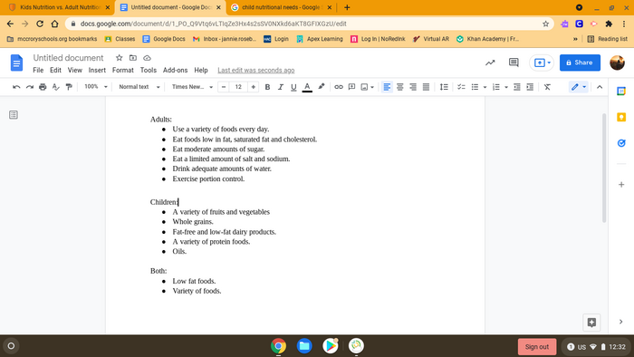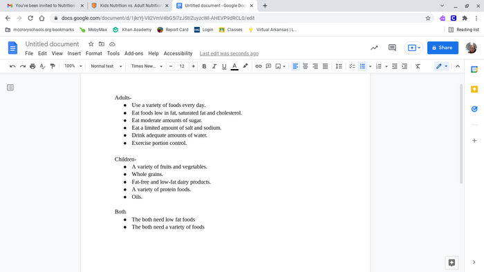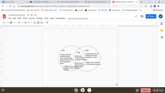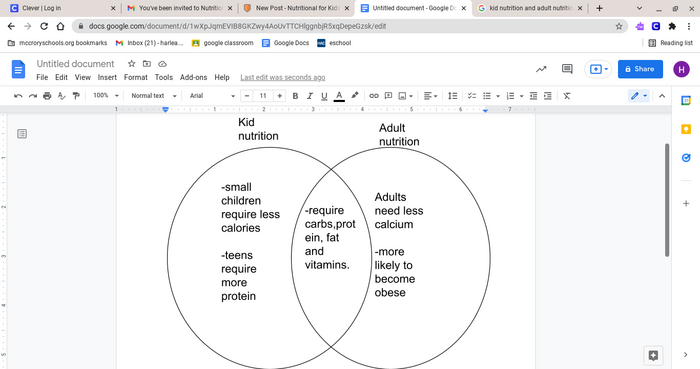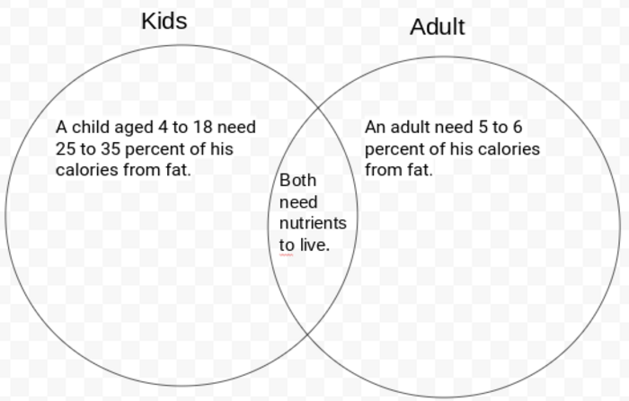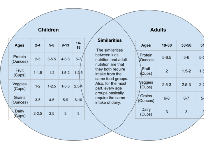 Create a Venn Diagram on Google Draw representing the difference in nutrition in kids and adults. Describe the different nutritional needs of each age range, and explain any similiarities you find. Upload your image here.