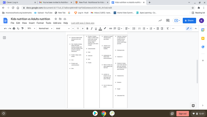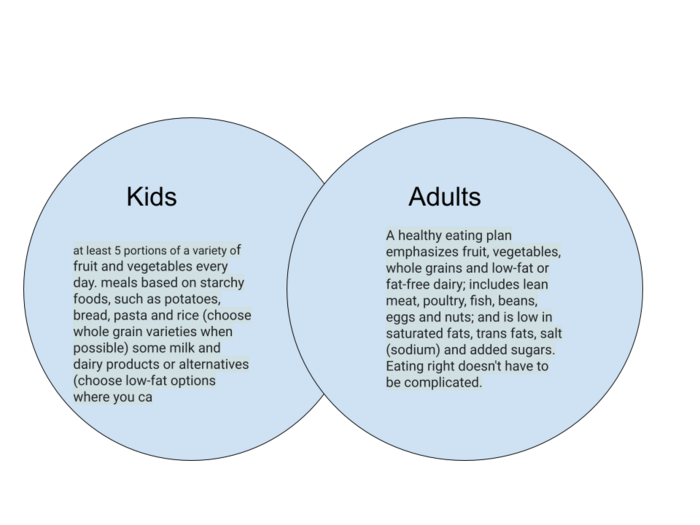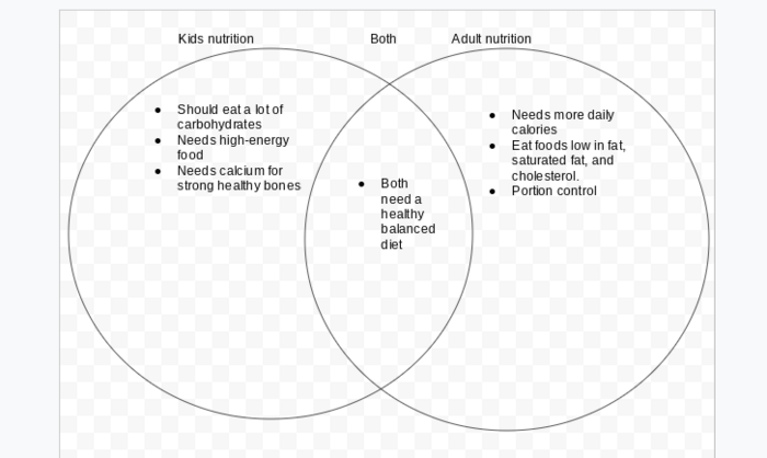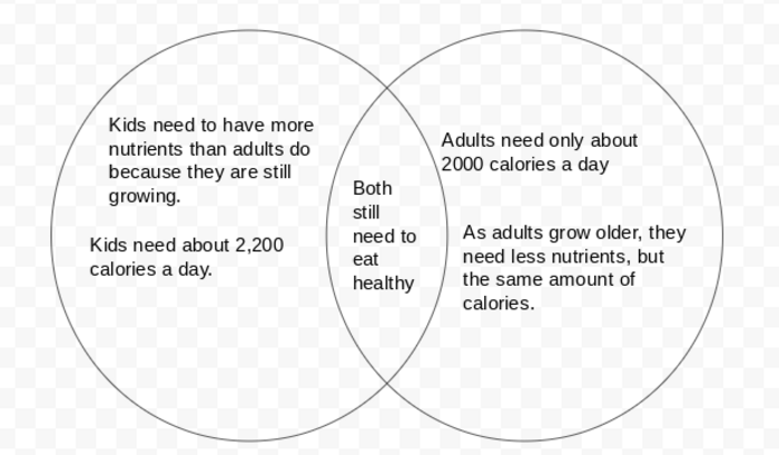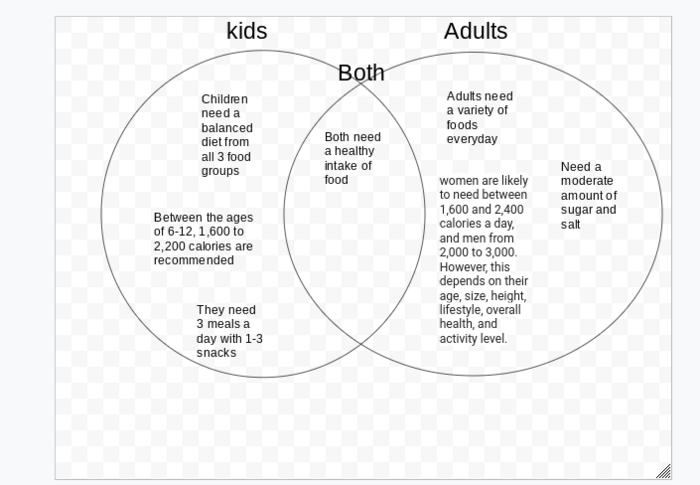 Create a Venn Diagram on Google Draw representing the difference in nutrition in kids and adults. Describe the different nutritional needs of each age range, and explain any similiarities you find. Upload your image here.