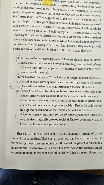 As a parent, my goal, is to follow these reforms with my three children. I'm sure there will be struggles, especially when they realize that there may be peers that don't have to follow them. As a teacher, I would love to allow more unsupervised play and independence, but struggle with finding the time. As "homework" this year, I told my students that I'd like them to play outside for 15 minutes every day, but I know that many are not able due to activities, home situations, etc. I wish I could give them time outside during the schoolday somehow to make sure they were all getting it. I was delighted that the district adopted a phone free policy this year. It's not much of an issue in elementary school, although it does come up sometimes, but I would love to know what differences are being seen in secondary because of this.