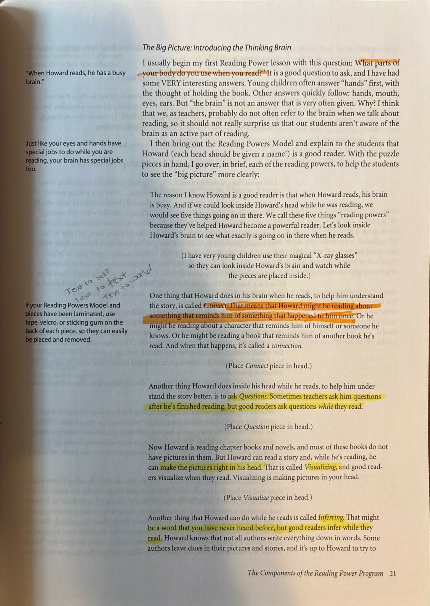 I like how this book is laid out so far. On page 21 it discusses how to help students make connections while they are reading. It reminded me of many of the new materials that just came out for the Geodes which I use in the classroom. There are usually activities that require the students to write about how the text relates to themselves, another text, or the world. This is exactly the type of practice this book is stating students should have. It goes one step further however and explains that struggling students might not do this naturally and that they may need a lot of modeling beforehand. It fully lays out how to go about doing this. On page 31, it shows the four components of reading instruction and it reminds me of the “I do, We do, You do” method I already use.