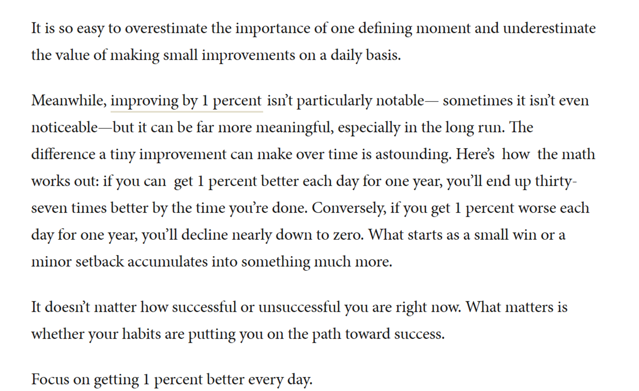 I love this part of the book- improving just a little bit and being consistent with tiny improvements is meaningful and important.