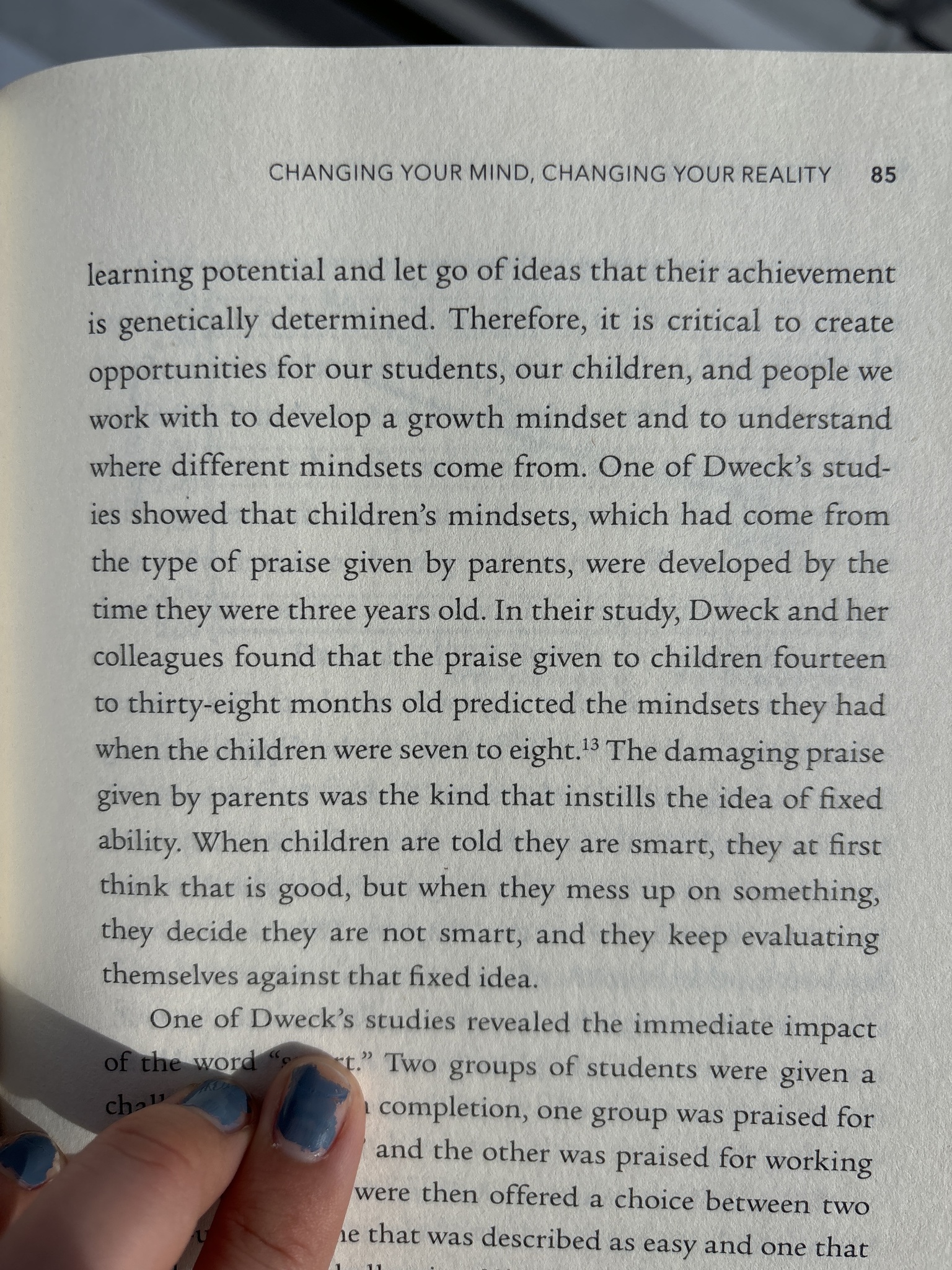 If the type of praise given at home as a child determines a persons mindset how do we fix this mindset and encourage students to grow? I was happy to see later in the chapter the author presented genuine strategies to help kids transition from fix to growth mindset. One particular strategy I liked was beginning and ending each class with a growth mindset activity to encourage focused time each day teaching students how to change their mindset and acknowledge their mental approach to challenges.
