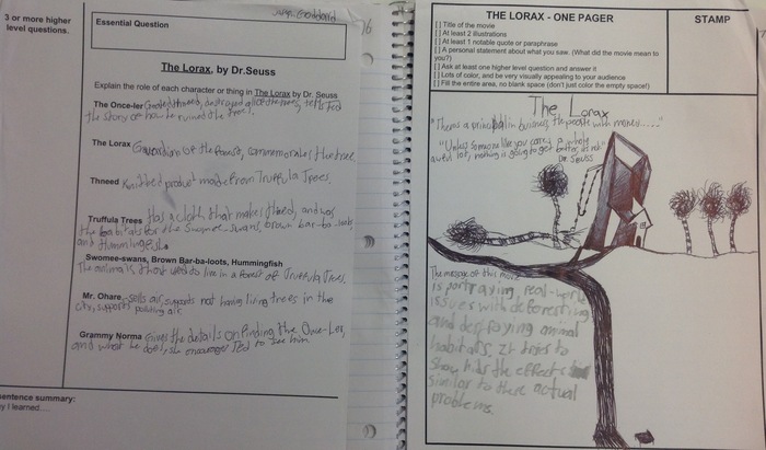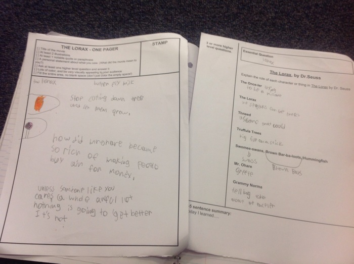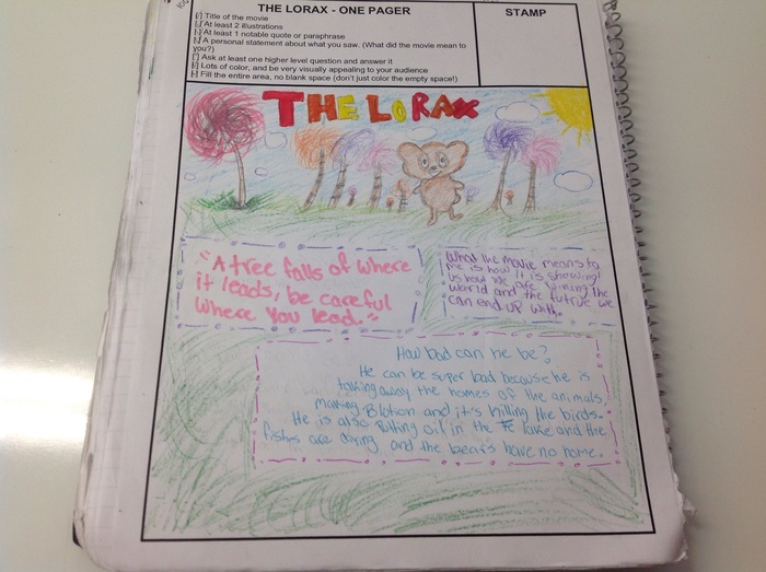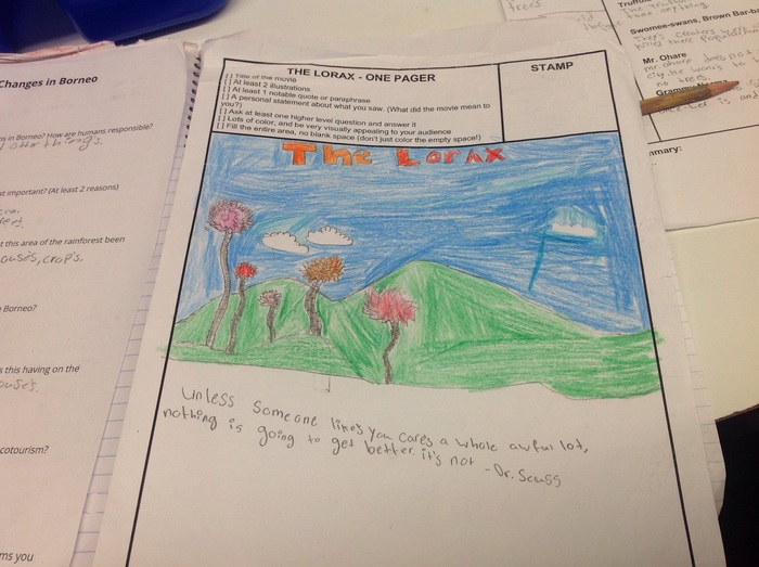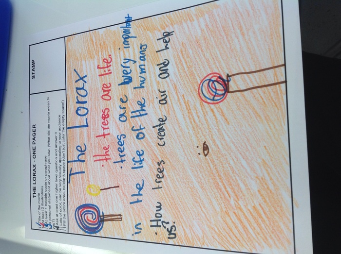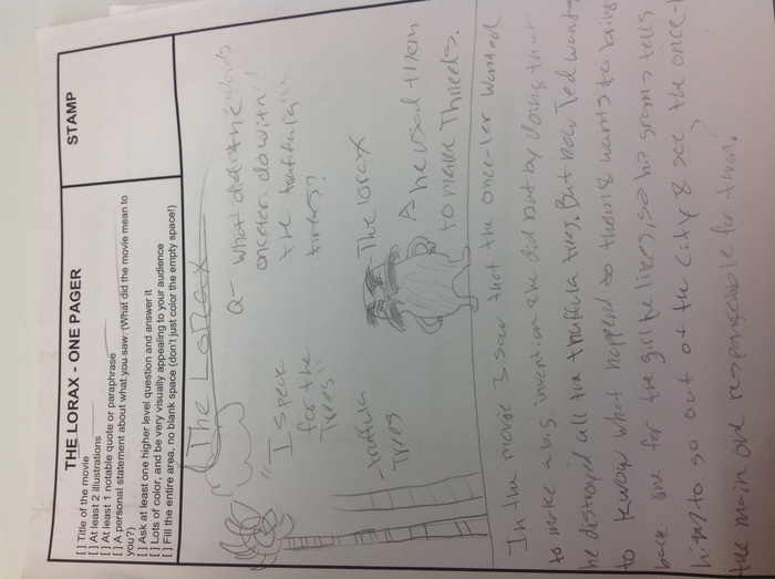 Turn in a picture of your One Pager for The Lorax (page 106). Remember to read the directions on the top!!