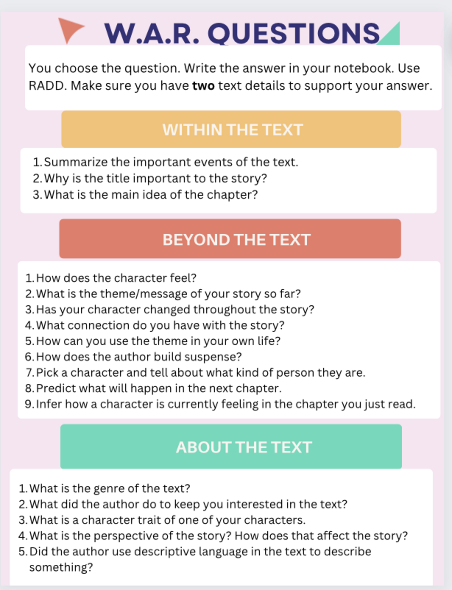 This was used for students to have choice and choose a question to write about after reading their book club book to check for comprehension