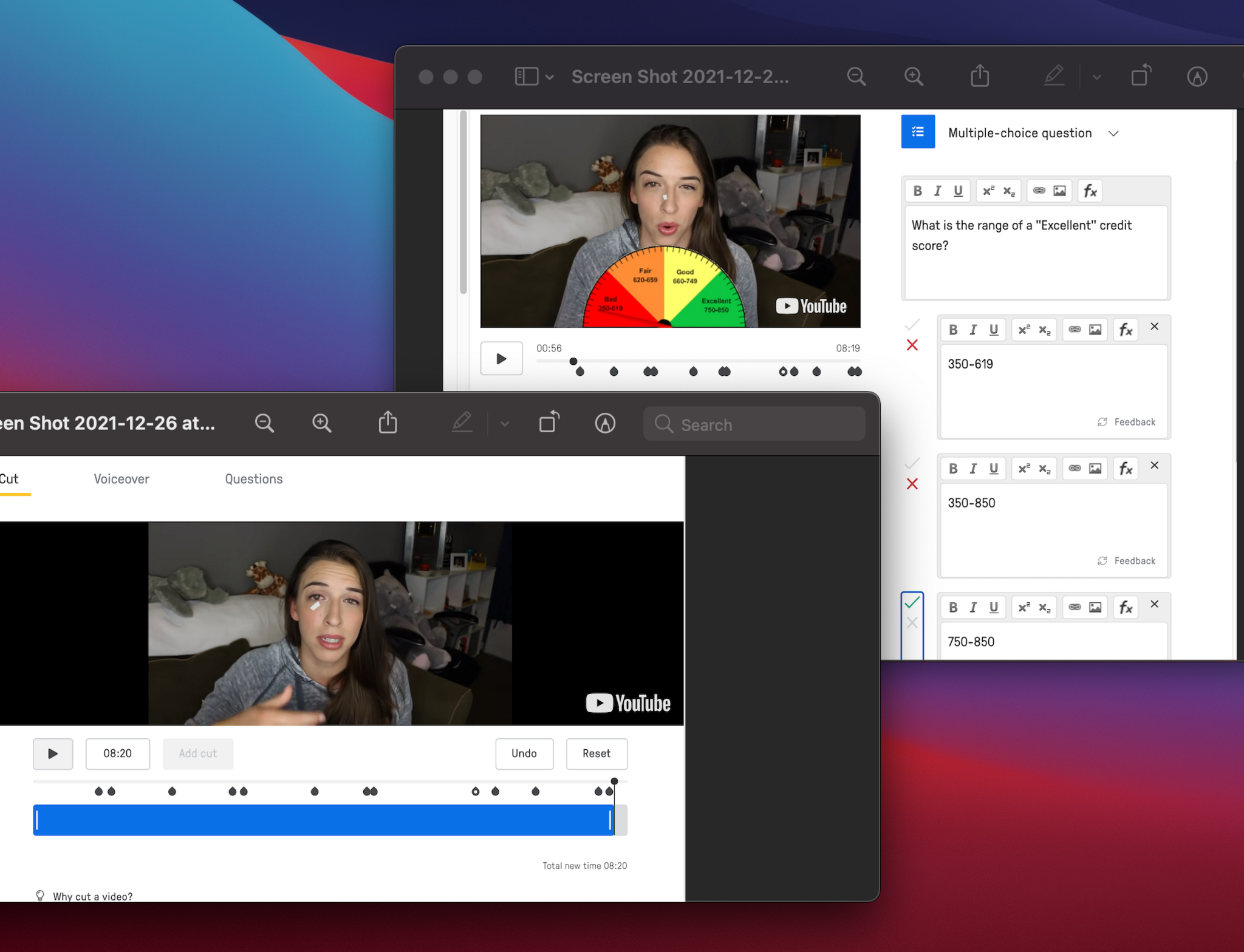 Cutting a video on the left (cut out the like and share option) and on the right I added a question on the Excellent range of a credit score