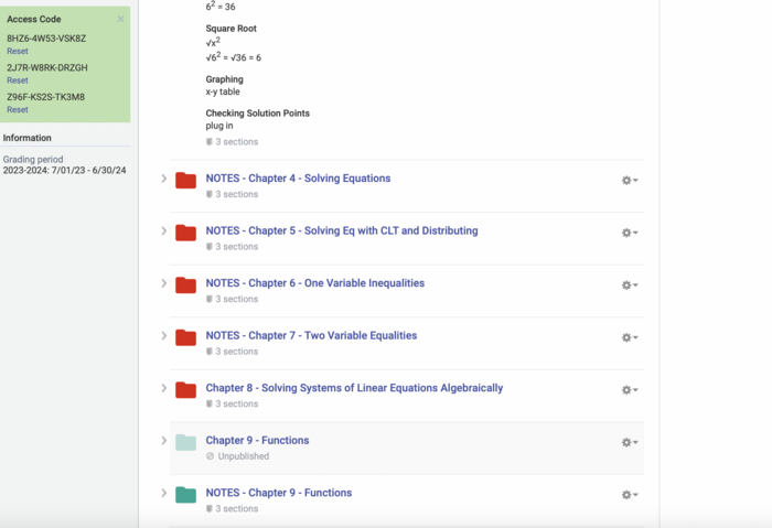 I color-coded units to make them easier to find. Within units, the topic we're currently working on is green and upcoming units are grey.
