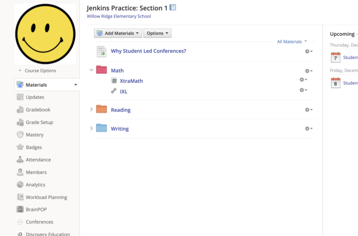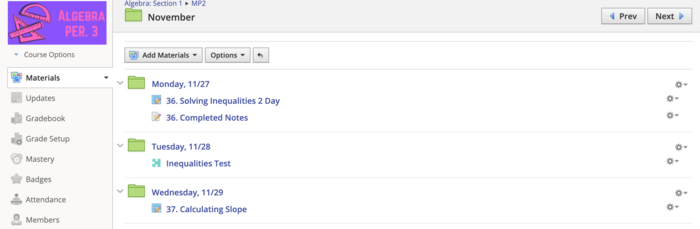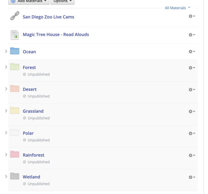 I decided to organize my course with folders. I used the colors that they use all of the time. Links, directions, and materials can be found in the matching subject folder in the course.