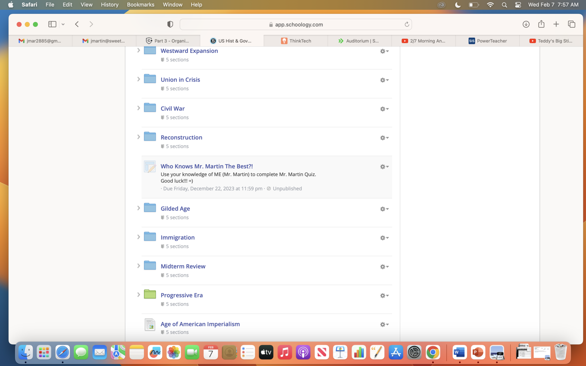 USH folders are organized chronologically, Blue Folders (Past), Green Folder (Current). All assignments, videos, etc. in folders.