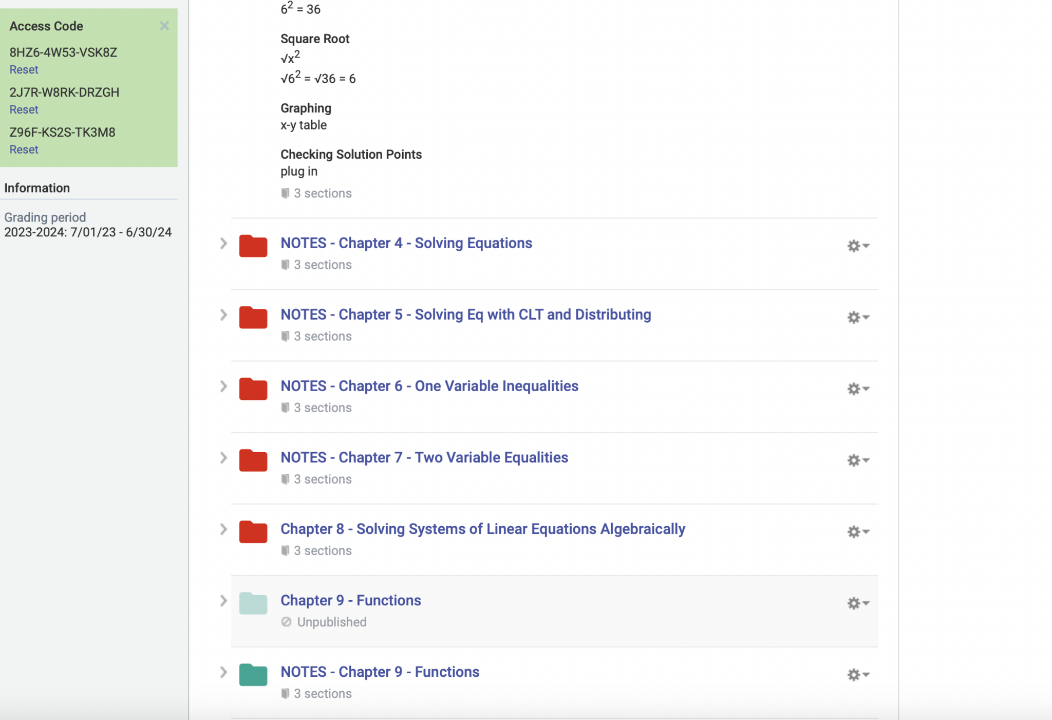 I organize my materials in folders. Red folders are for past units and the green folder is what we are currently working on.