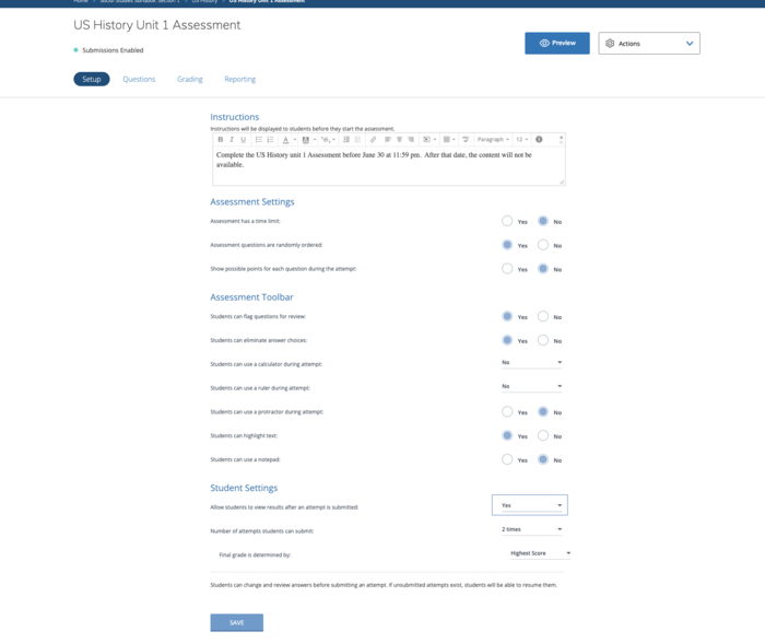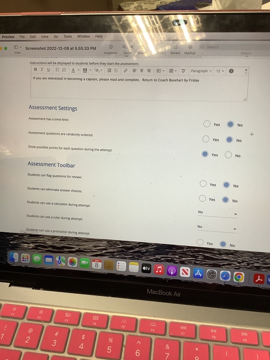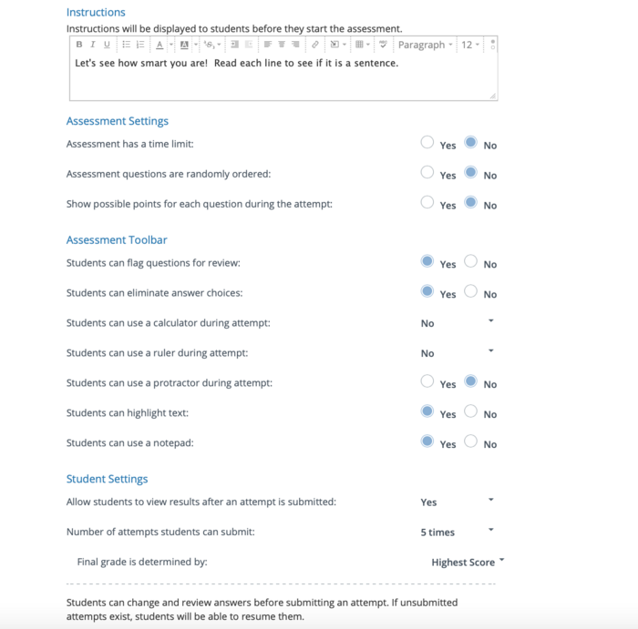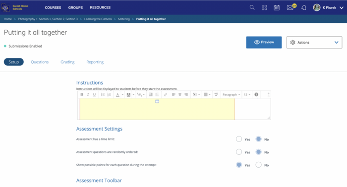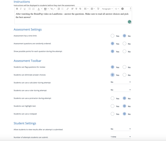 Take a screenshot of your settings page after you have altered anything that you want to for your assessment. These can always be edited later on if you change your mind. PRO TIP...You can add a variety of content to your instructions such as videos to give students directions.