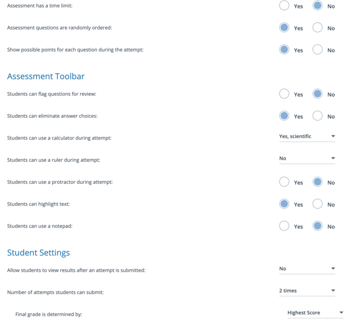 Watch the video below about how to create an assessment in Schoology. Begin watching at the :25 second mark and watch the remainder of the video to see all of the settings you have available to you.