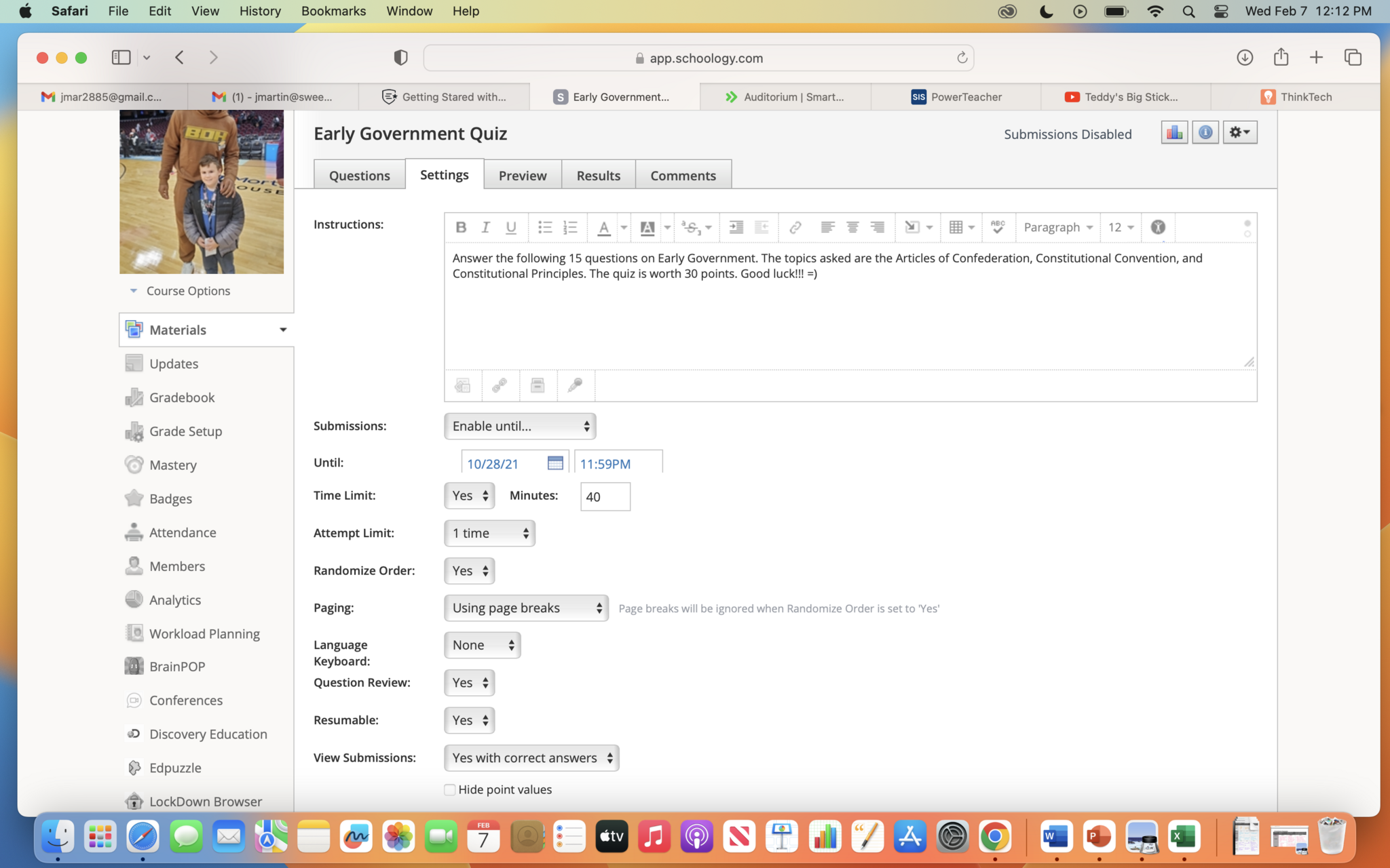 Test/Quiz Settings