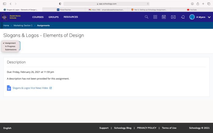[1] Create the assignment in Schoology that you want students to access the document you created in Part 1 of this badge. - (be sure to attach your google file as described in the video)