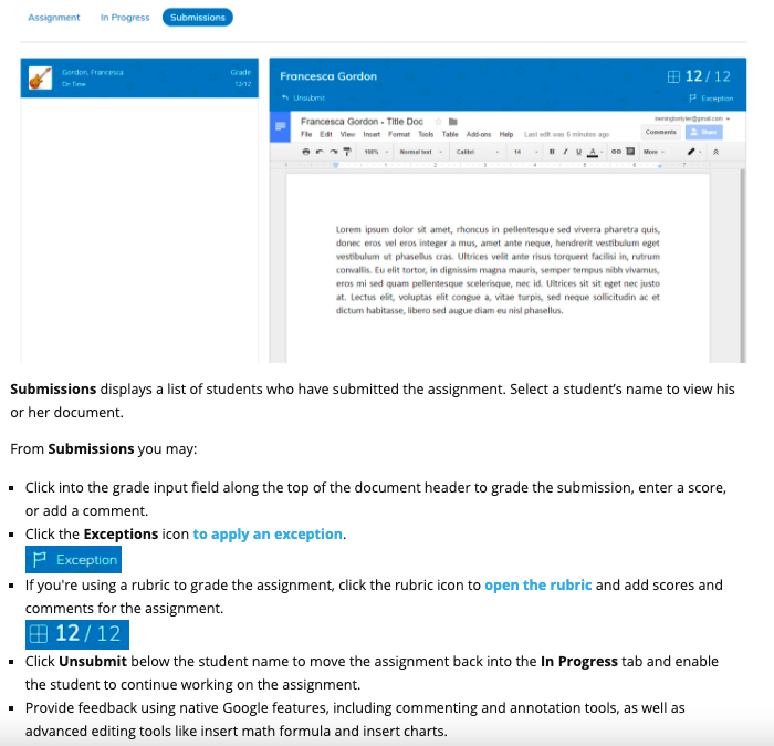 Look below for some helpful information on how to grade an assignment that is in the submission tab you saw in the video above.