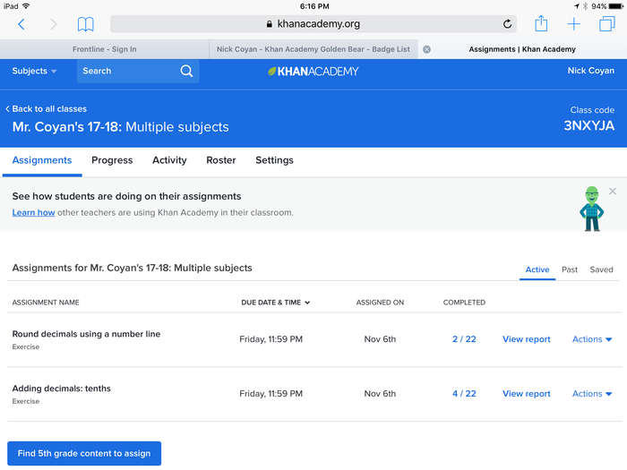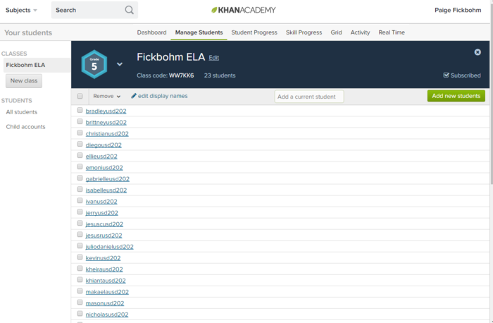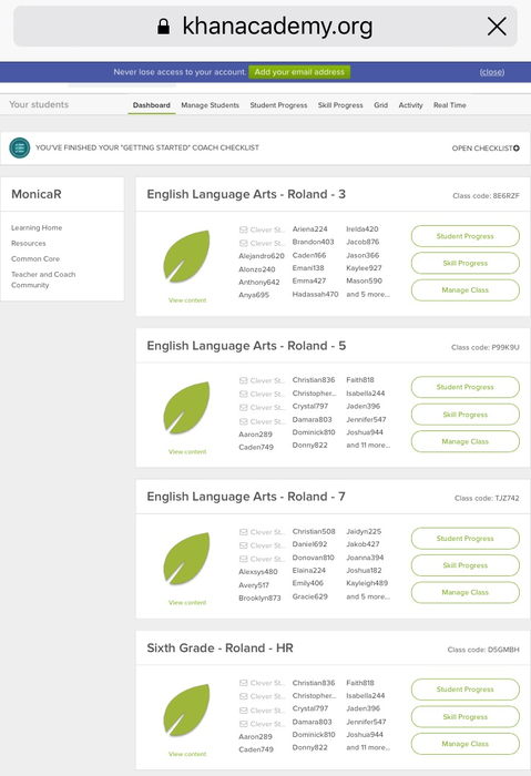 Take a screenshot of your dashboard that includes your name and the Khan Academy classes you have.