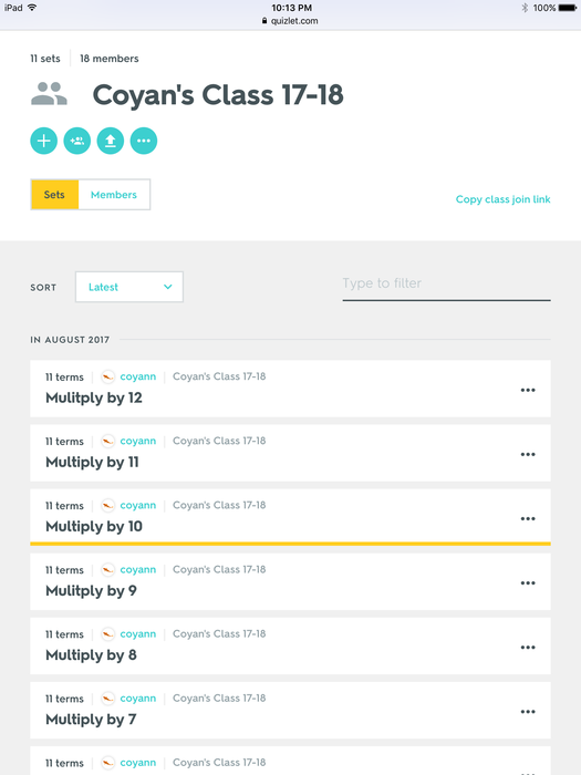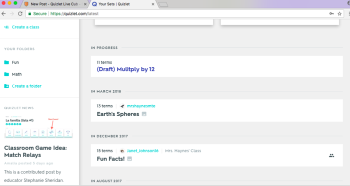 Showing the recent quizlet's we have used. We used fun facts/multiplying as live.