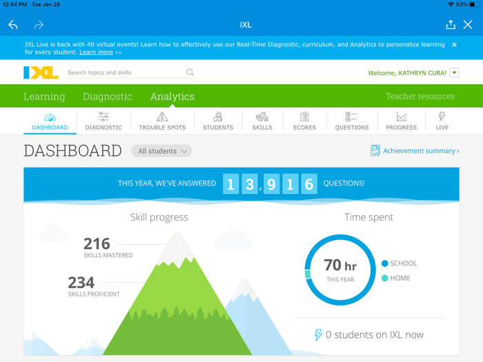 Submit a screenshot of your Analytics screen once: - Teacher has successfully signed in - Students have successfully signed in - Class has answered at least 500 questions in total - Teacher has explored Analytics for 3 weeks - Class has been active for 3 weeks
