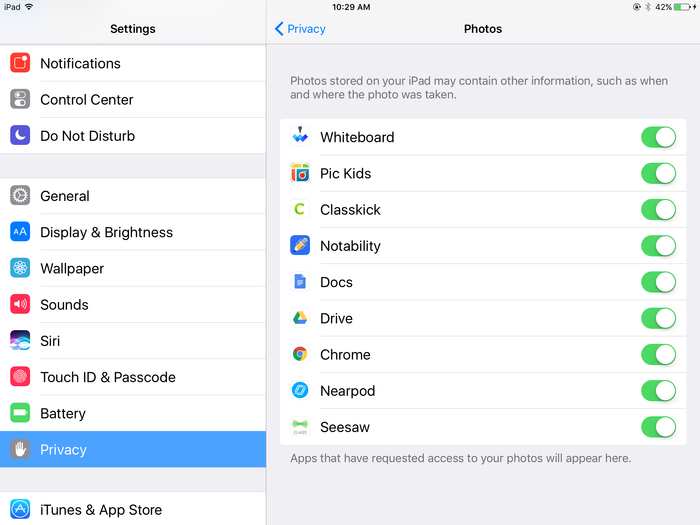 Open SETTINGS and choose PRIVACY. Select Photos, Camera, and Microphone, selecting apps you want to grant access to use these features. Take a screenshot of your privacy settings in one of these menus and submit as evidence for this badge.