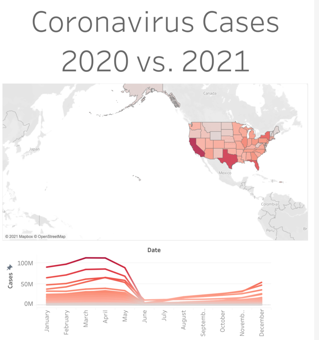 When a state is clicked on the map for covid-19 cases, a line in the line chart is highlighted showing the cases through the year.