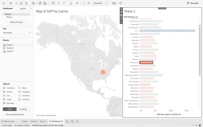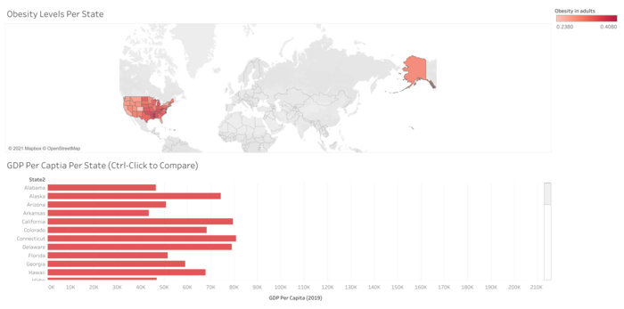 (By clicking a state on the map the corresponding state's GDP will be highlighted)(You can compare two state's GDP levels against each other by consecutively clicking each state)