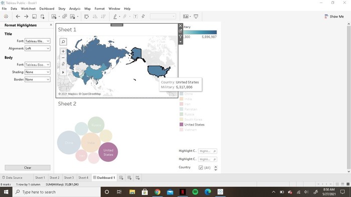 This is an interactive dashboard used to visualize the differences in the size of the active and total military of 8 countries. By hovering over the a certain country in the map a corresponding bubble is highlighted to show the proportion of its active military with other countries.