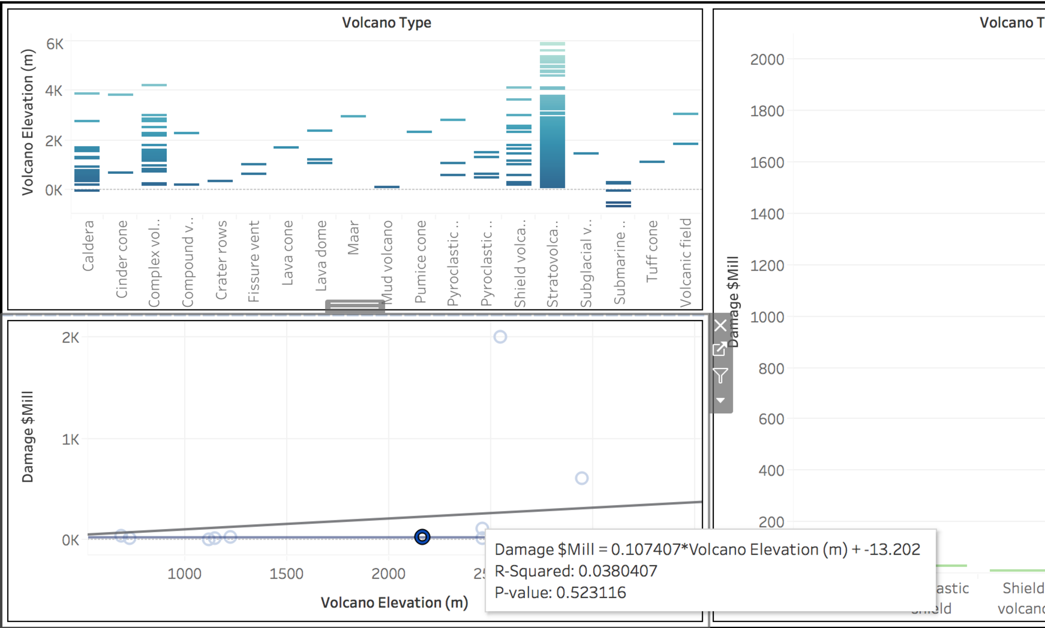 This is showing a trend line of an association existing between volcano type elevation and damage cost